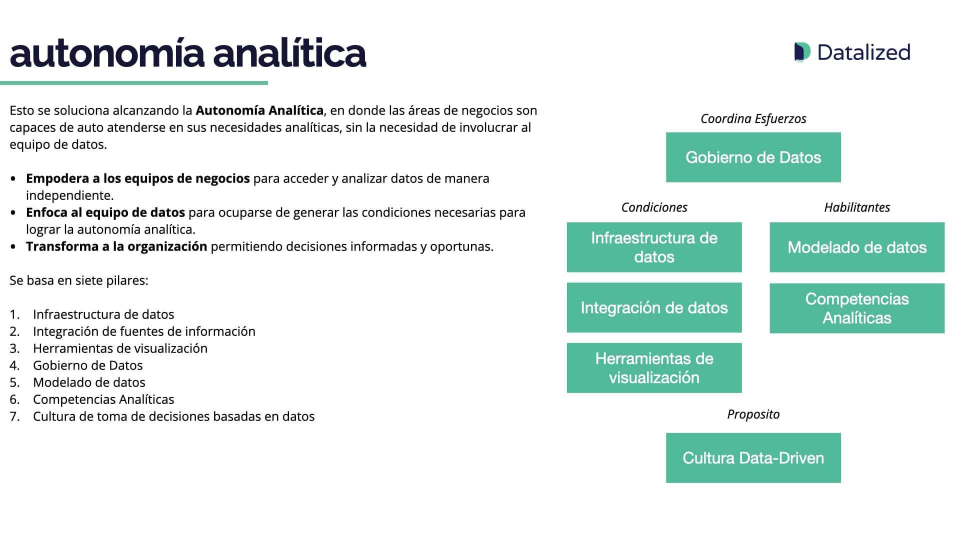 La Autonomía Analítica se basa en siete pilares que se componen de temas técnicos y temas organizacionales. No todos los pilares se deben desarrollar al instante, algunos son más relevantes en determinadas etapas, pero todos deben estar en un nivel maduro para llegar la Autonomía Analítica.
