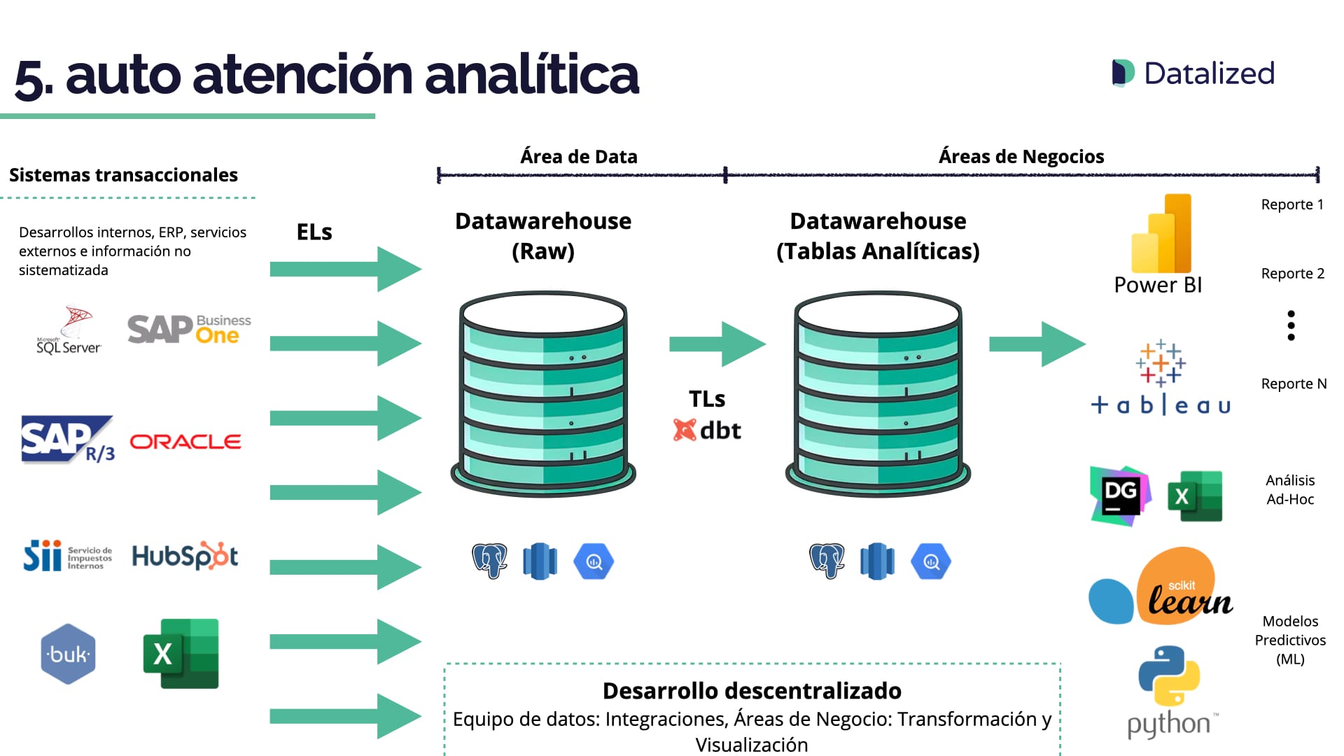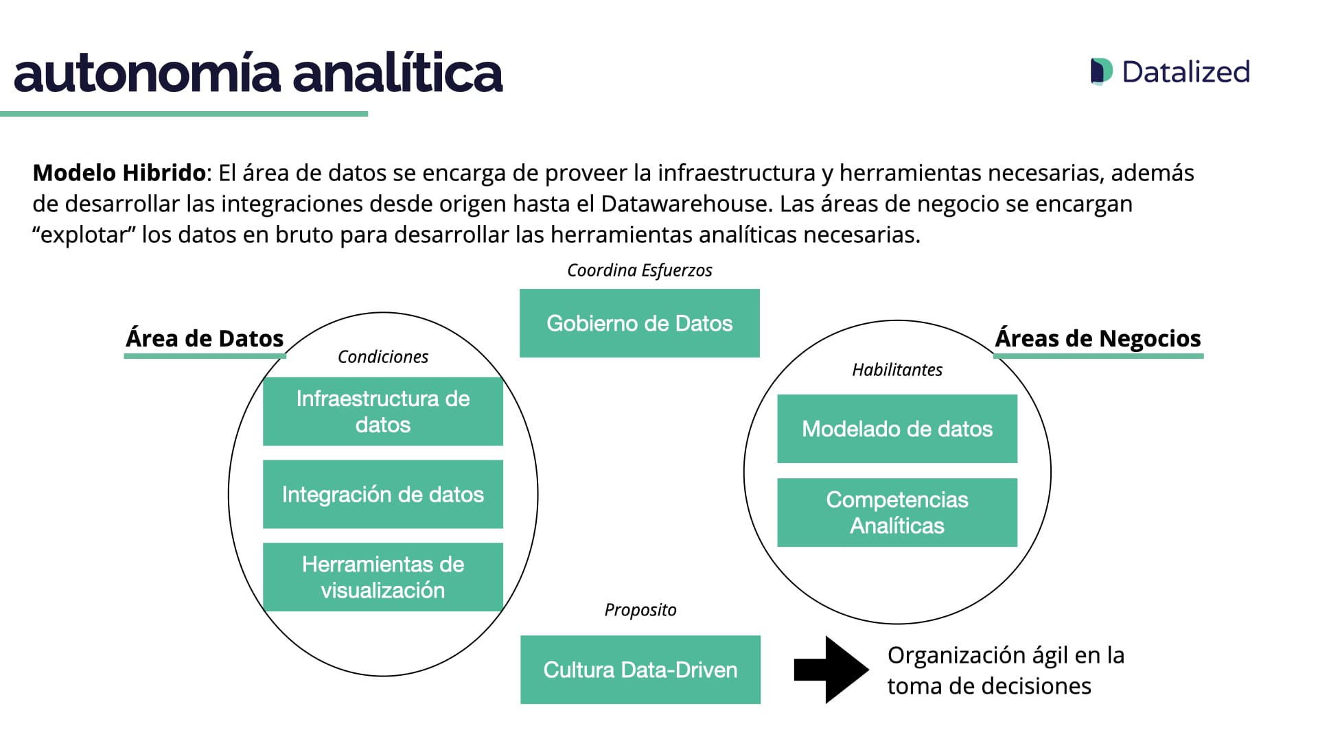 - Las áreas de negocio gestionan sus propias necesidades de análisis mientras el equipo de datos se enfoca en proyectos avanzados.