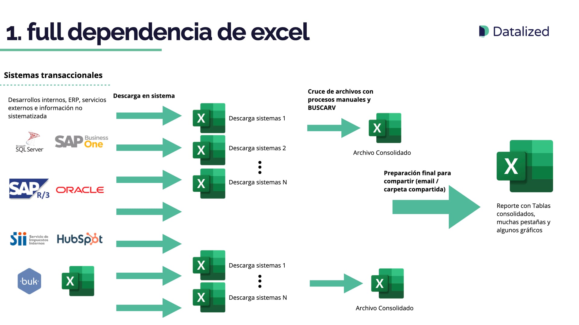 - Los análisis se realizan principalmente en Excel, lo que limita la escalabilidad y genera errores.