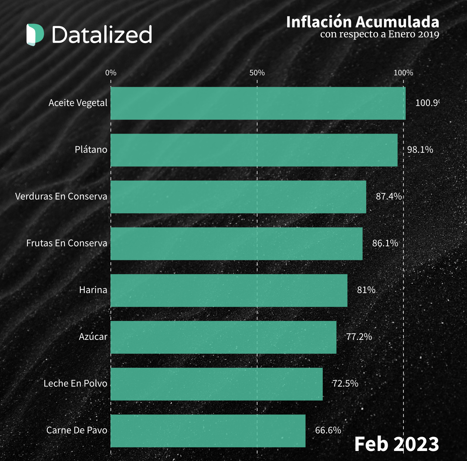3️⃣ "Alimentos" es la categoría con un mayor crecimiento en sus precios en este período. Esta contiene productos de "Frutas y Verduras", los cuales presentaron un alto crecimiento (por ejemplo el Plátano con un 98,1%). En esta categoría destaca el Aceite Vegetal 🍶(100,9%), la Harina 🥞 (81%) y el azúcar 🍭 (77,2%)