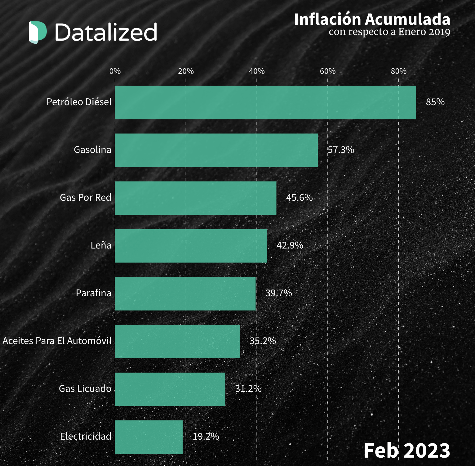 1️⃣ "Energía" permanece todo 2020 como la categoría con menor inflación, pero a partir de 2021 está consistentemente dentro del top 3 (y muchas veces top 1). Para febrero de 2023, los productos de esta categoría con mayor crecimiento son: Petróleo-Diésel (85%), Gasolina (57,3%) y Gas por red (45,6%).