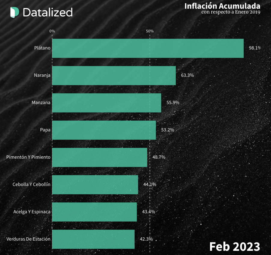 ️2️⃣ A lo largo del video se puede apreciar que la categoría "Frutas y Verduras" presenta un constante sube y baja en sus precios, debido a la temporalidad en el precio de los productos que componen esta canasta. Al final de dicho período se presentan como la 2da categoría con mayor crecimiento de 98,1% en Plátanos 🍌, un 63,3% en Naranjas 🍊 y un 55,9% en Manzanas 🍎