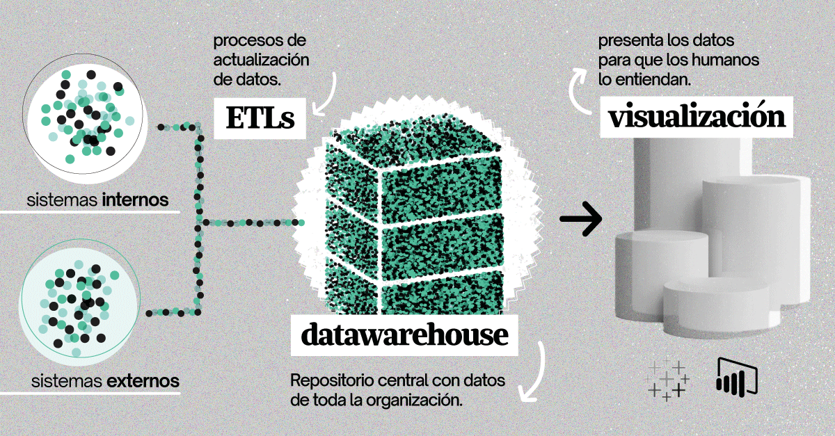 Este problema, principalmente técnico, se resuelve a través de la centralización de información en un repositorio central. Este repositorio es conocido por muchos nombres, como Data Lake, Data Mart o Data Warehouse (¡este último es el que más nos gusta a nosotros!). En palabras sencillas, es una base de datos que almacena información desde distintas fuentes utilizadas en la empresa y es capaz de disponibilizar información procesada para que usuarios no técnicos puedan analizarla de manera sencilla, muchas veces desde herramientas de visualización como Power BI o Tableau.